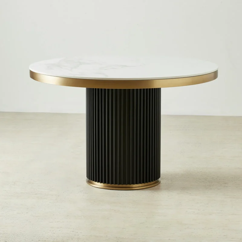 Sir Lionell II Gliding White Sintered Stone Round Dining Table – Walnut Brown Wooden Legs 150cm