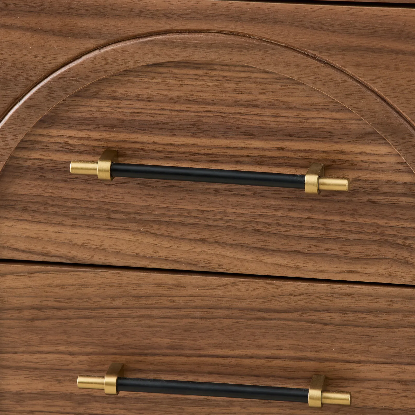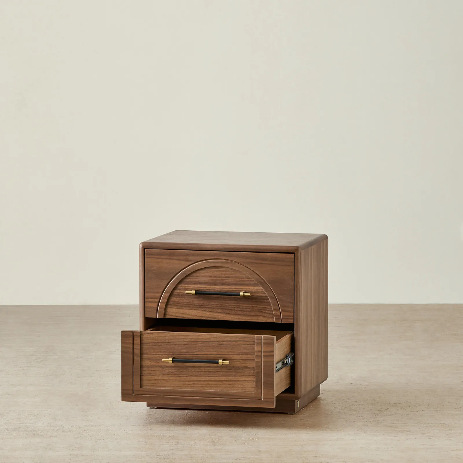 Two drawers provide space to store bedside items and keep surfaces clear. Black handles with gold-toned ends complete the piece with a clean, functional touch.