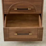 The Costanza Bedside Table is draped in mocha walnut veneer that brings warmth. Its front design features a carved arch detail that adds subtle depth and character.