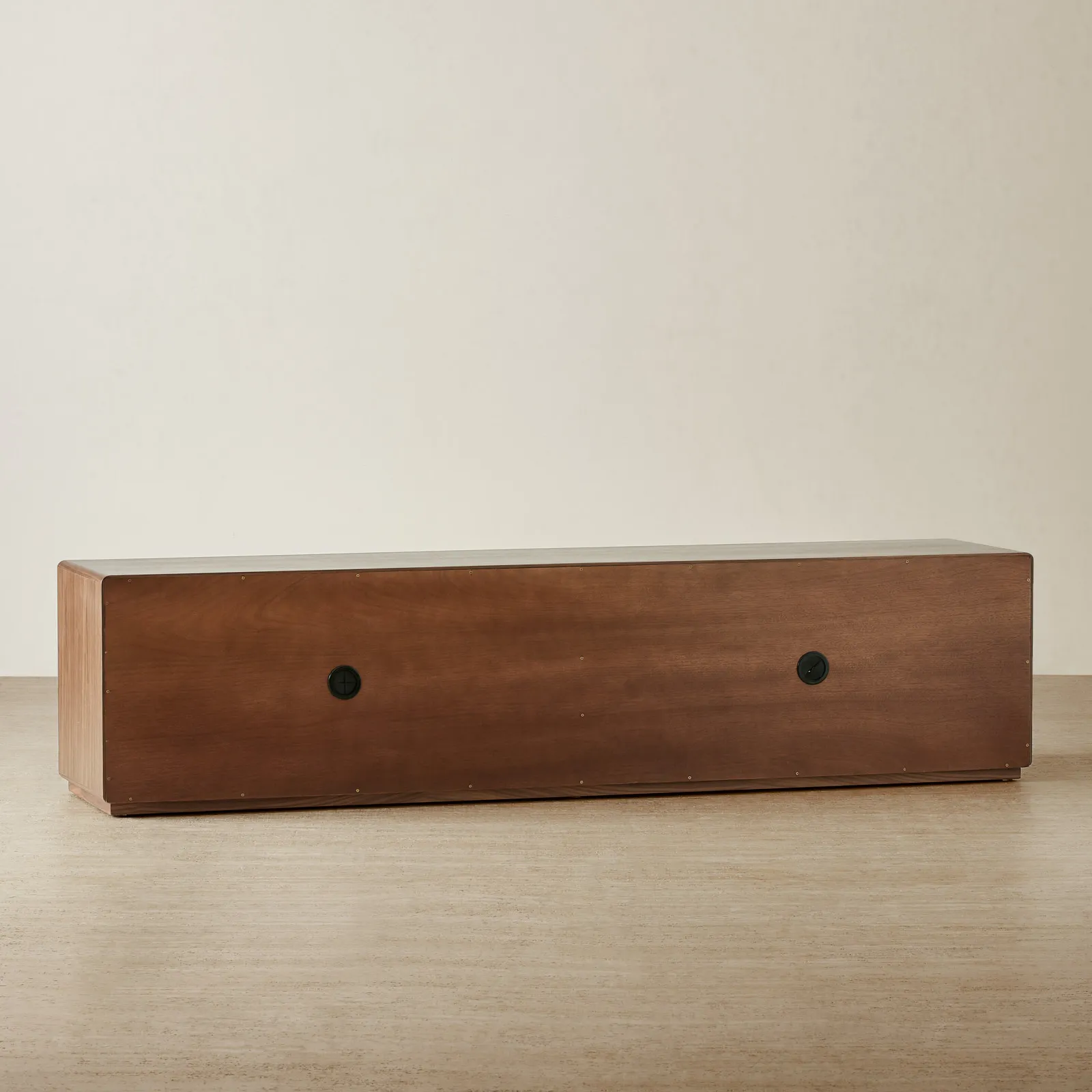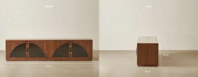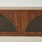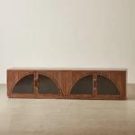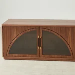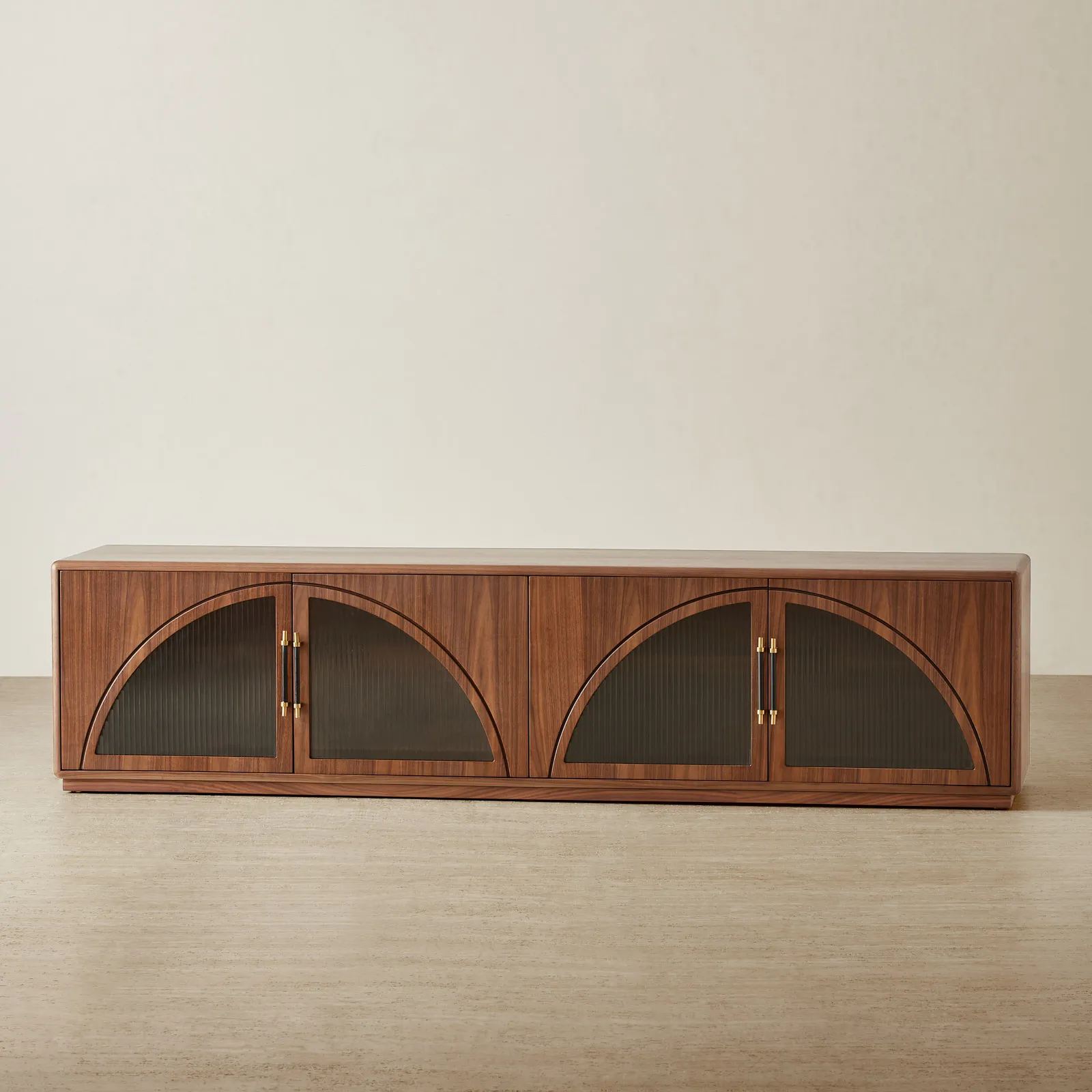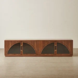 The Costanza Entertainment Unit blends streamlined form with subtle architectural detail. Its rich walnut brown finish frames four glass-front doors, each set with a distinctive semi-arch design that adds a modern twist to classic cabinetry.