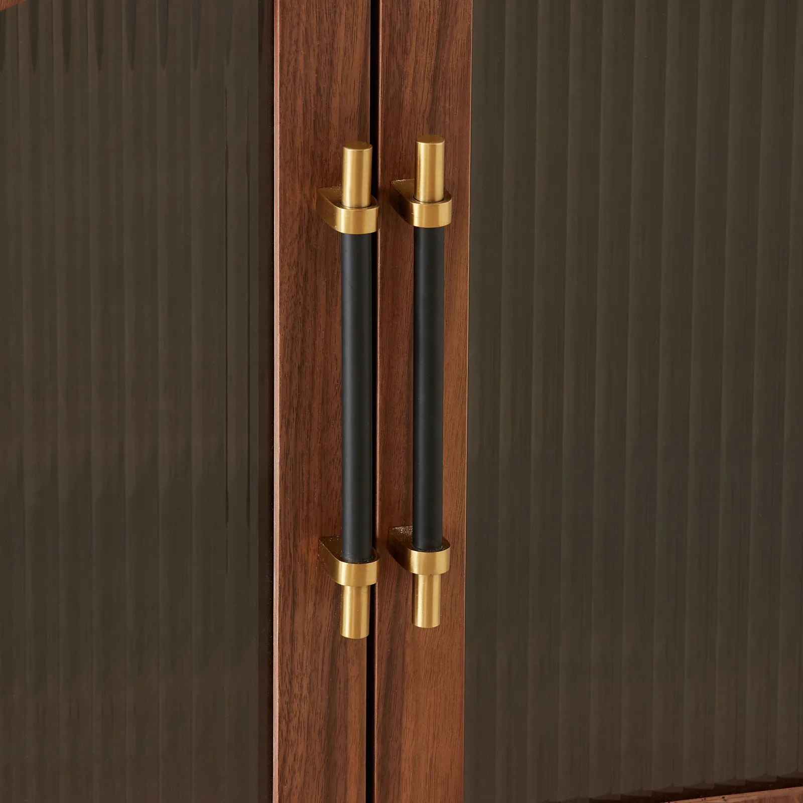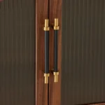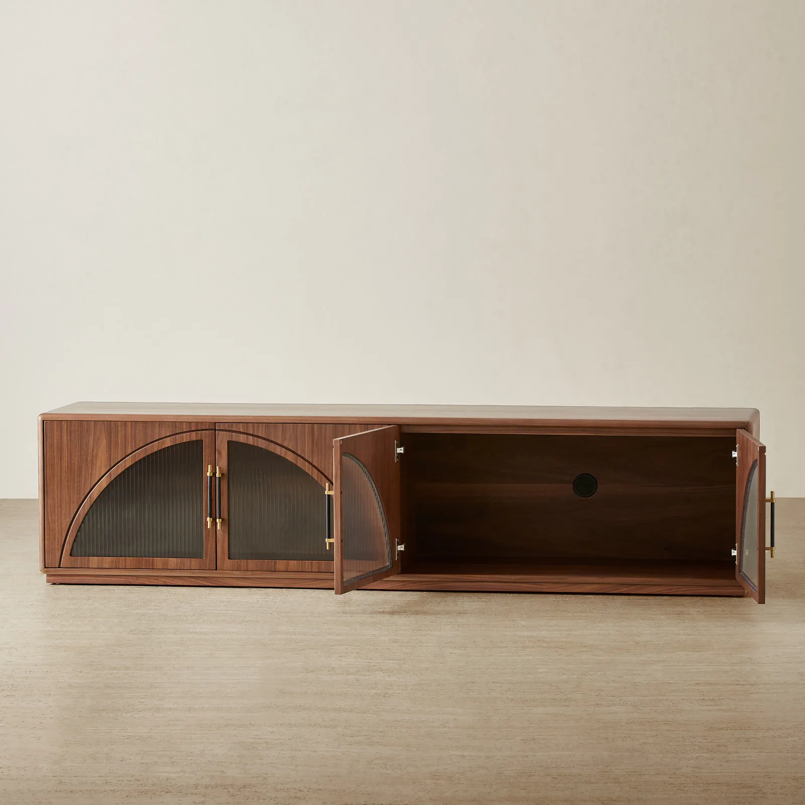 Inside, spacious compartments offer ample room for media devices, accessories, and décor. Brass-toned handles and ribbed glass panels lend a touch of refinement, making it a statement piece for any living space.