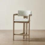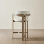 Clean lines and quiet comfort define the Desmond Counter Stool. Upholstered in dove grey fabric, its seat and backrest offer a soft, supportive place to sit.