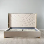The Gertrude possesses’ qualities that will elevate your bedroom’s style to heavenly heights. This majestic piece is made from high-quality materials and features a luxurious white and gold colour scheme that fits modern or minimalistic themes. The Velvet headboard is artistically designed with elegant curves and lines reminiscent of beautiful sand art. Supporting each side of the bed are two golden frames giving the piece a chic and luxurious aesthetic. This combination of stylish design and gorgeous colours makes the Gertrude an undeniable focal point for your bedroom.
