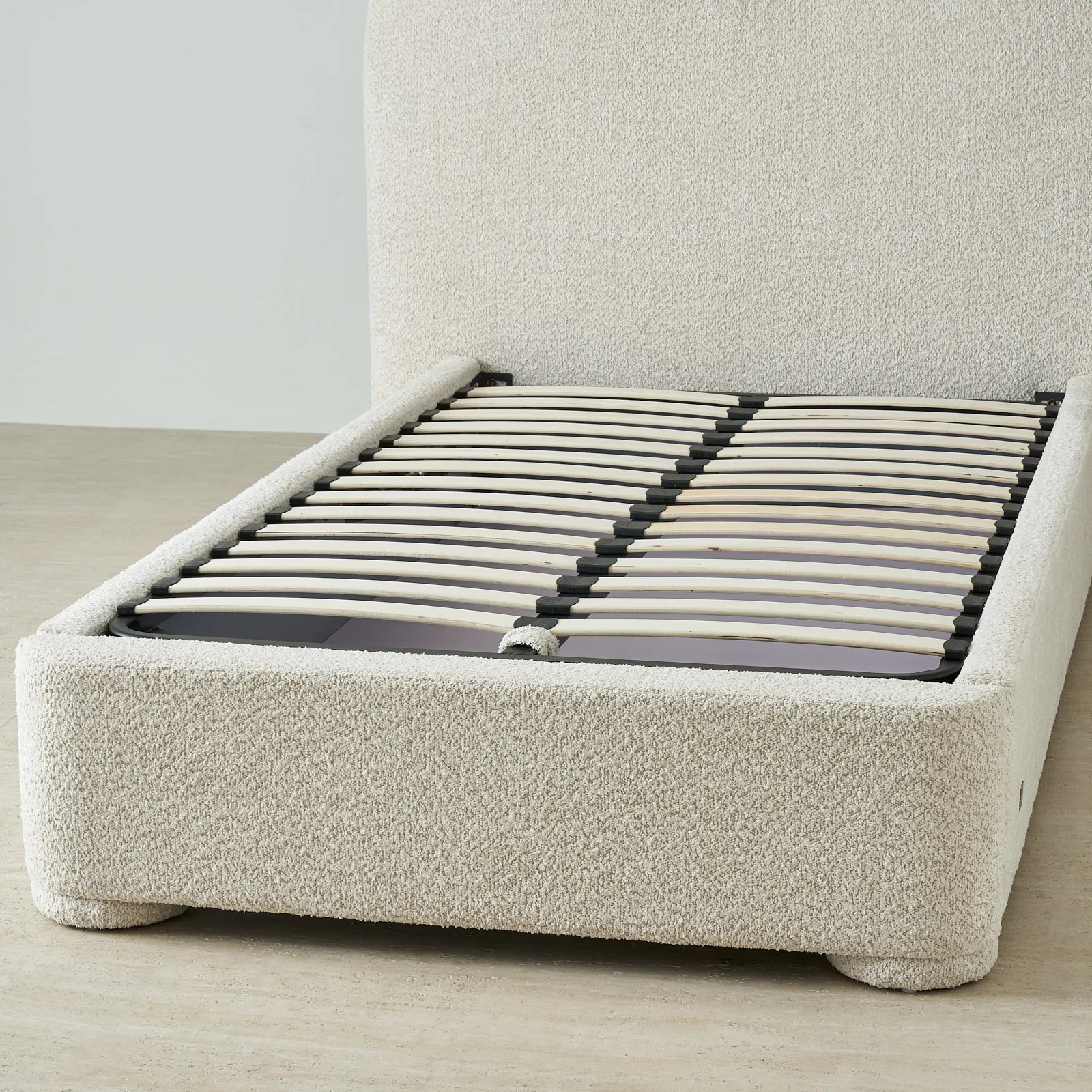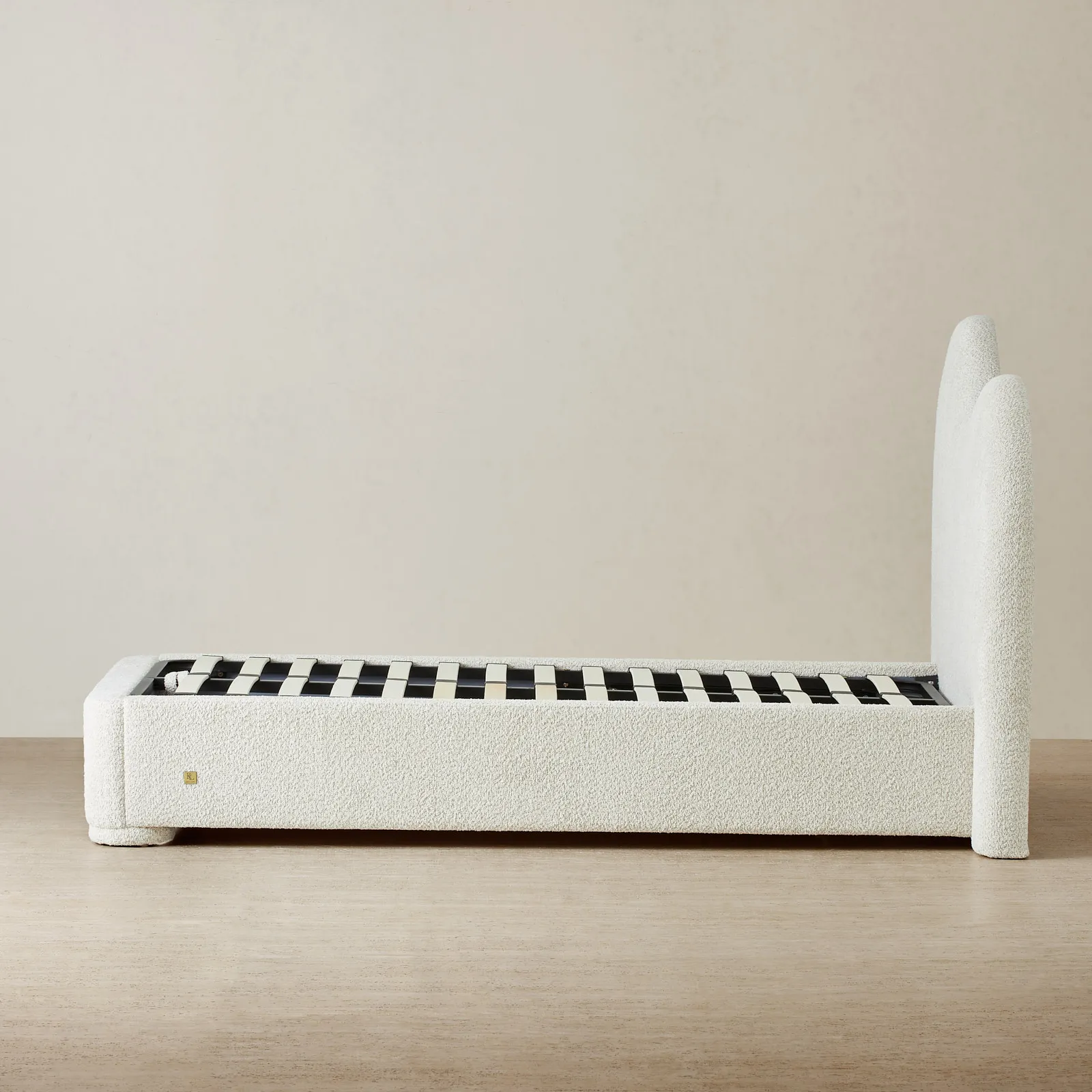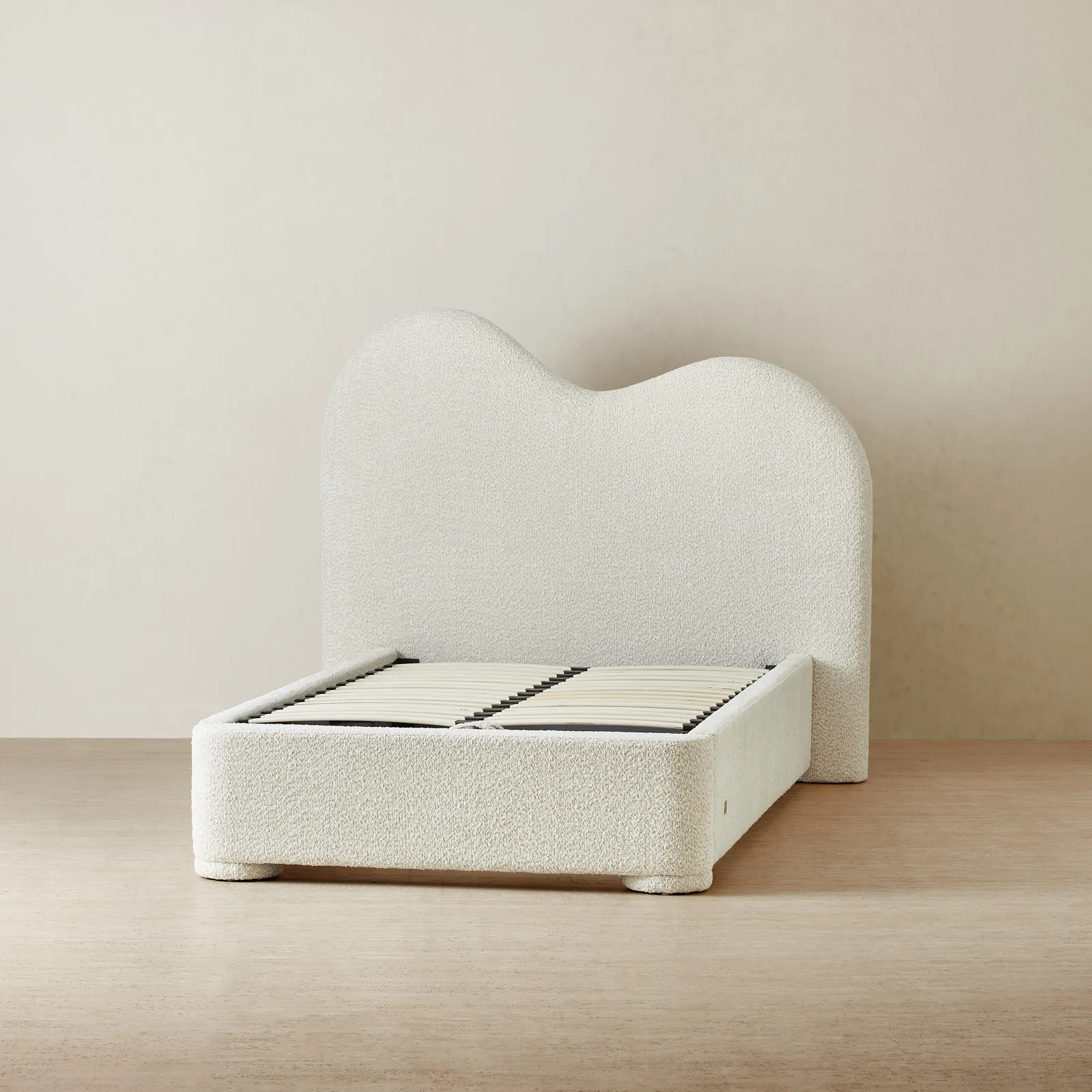 The Poppy Bed presents a sculptural form with a gently contoured headboard that suggests quiet movement. Wrapped in textured woven fabric, it offers depth and refinement.