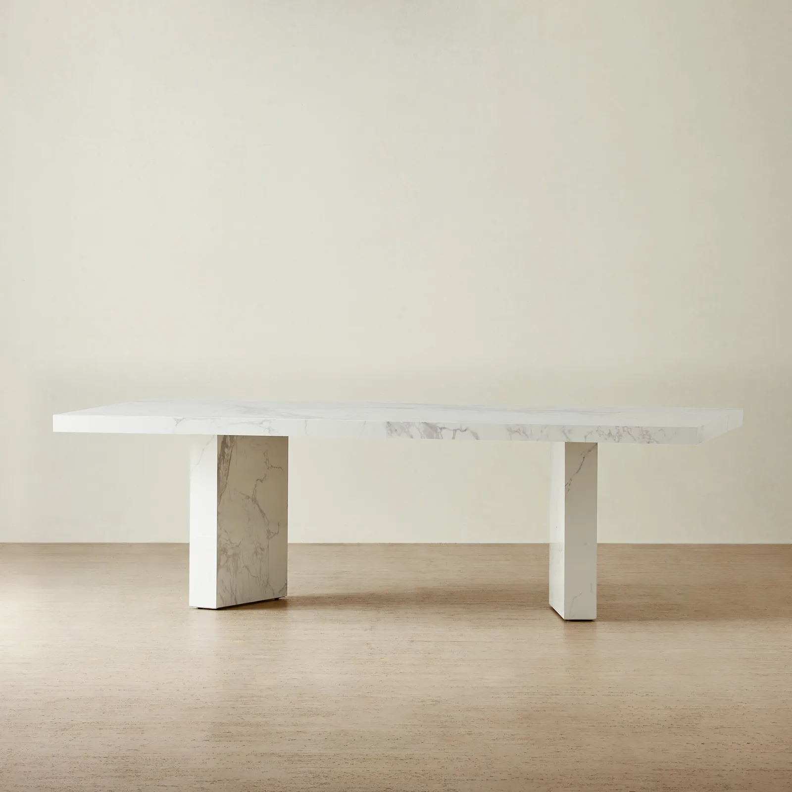 The Port Lucienne Dining Table has a striking monolithic presence with its bold slab design. Crafted from sintered stone, it offers the look of natural marble.