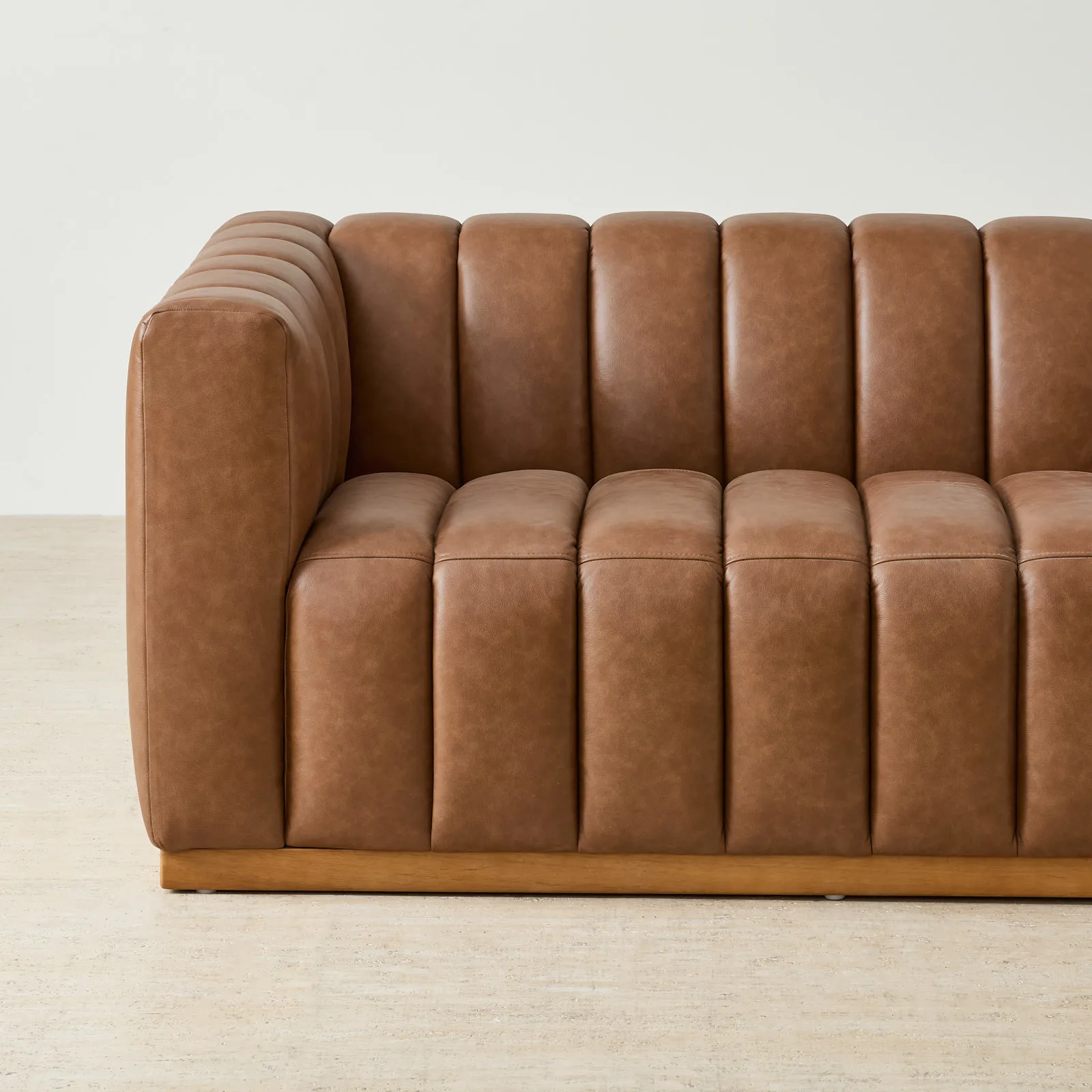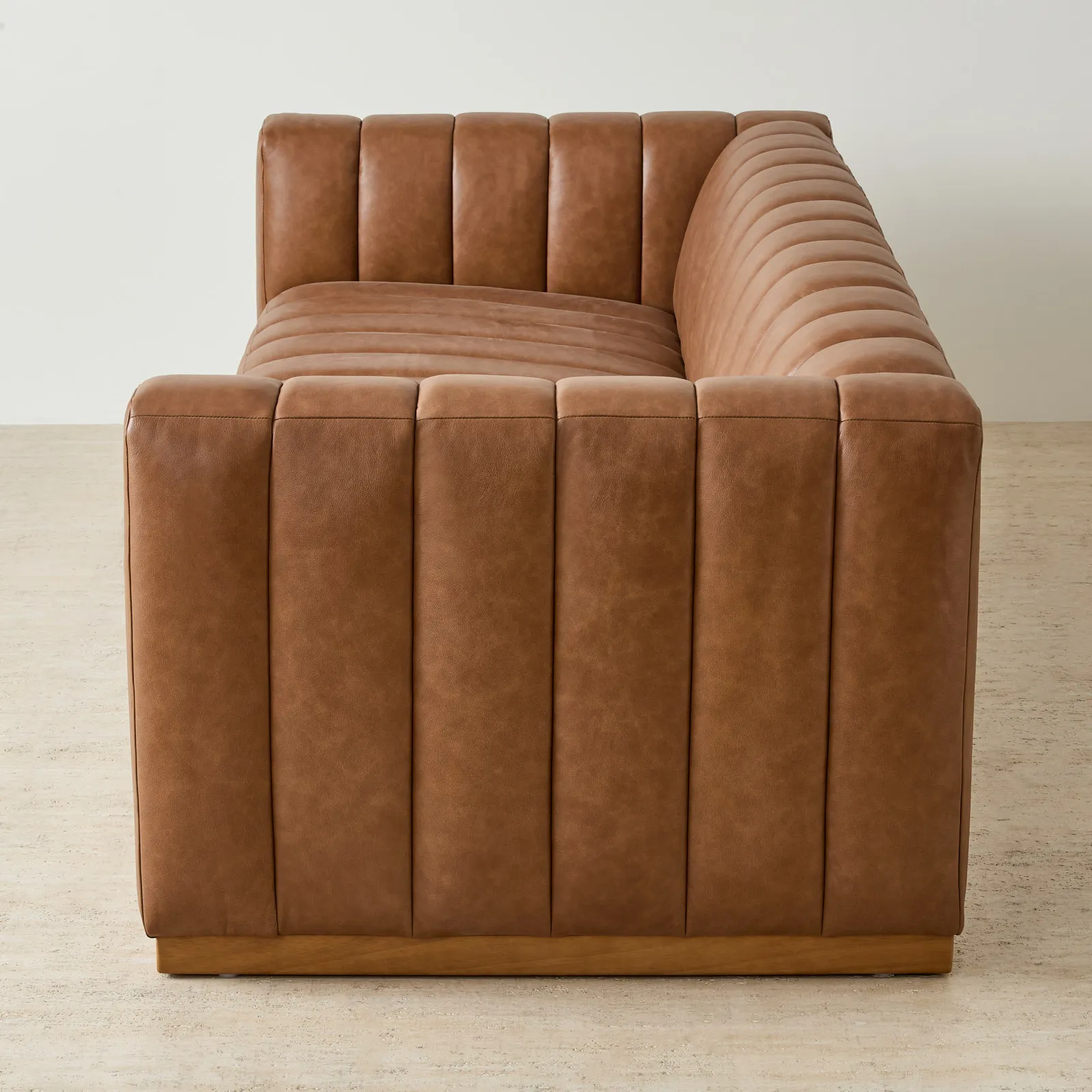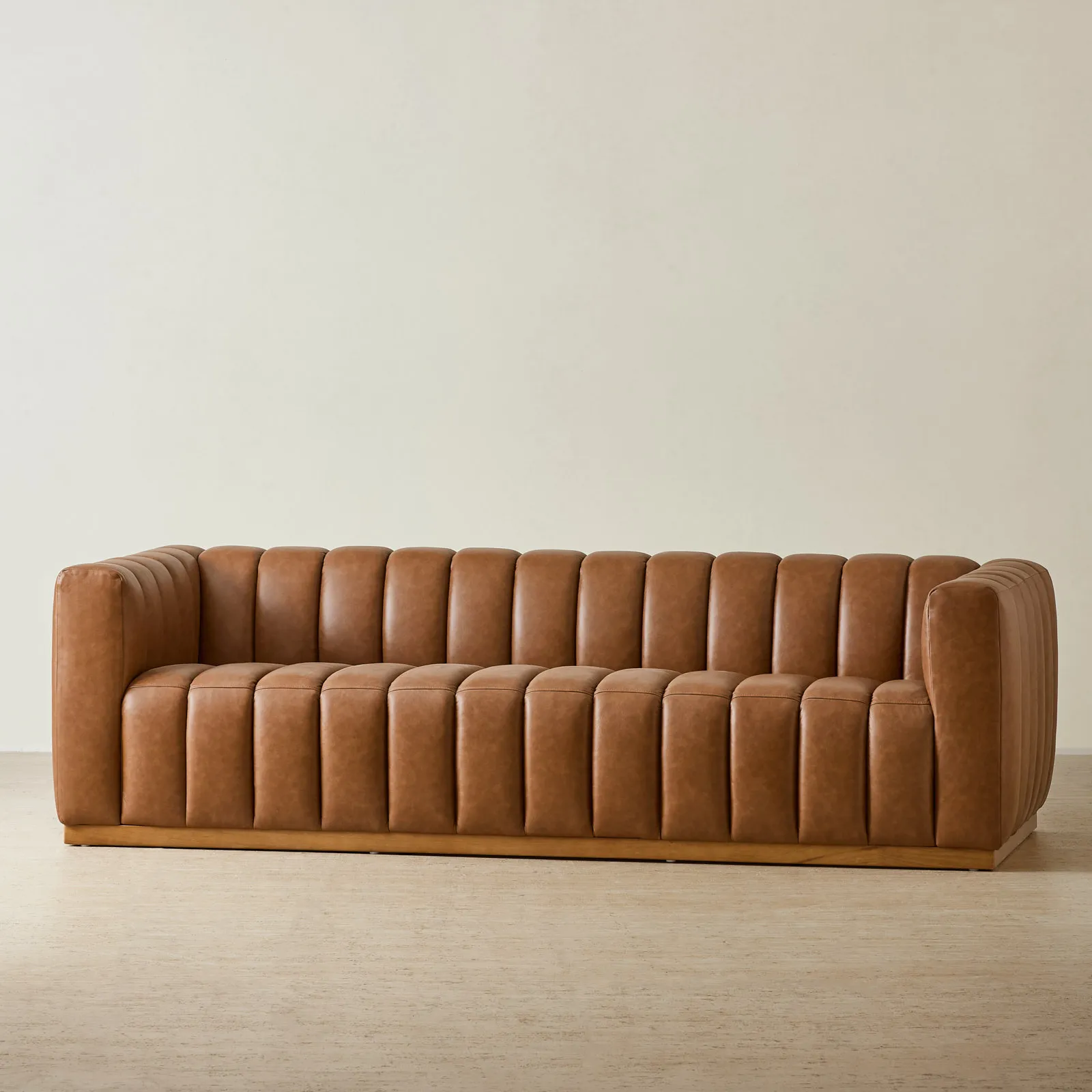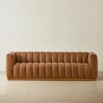 The Portia Vintage 4-Seater Sofa makes a bold statement with its deep vertical channeling. Upholstered in vintage tan leather, it develops character over time while offering a rich, lived-in feel.