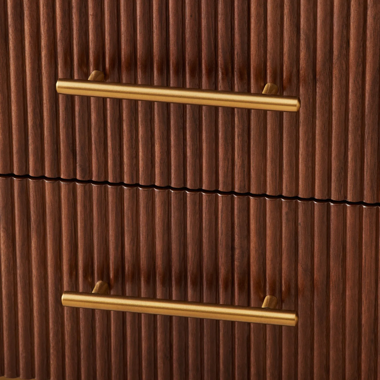 The walnut veneer body boasts a rich, textured finish that exudes warmth and timeless style. Featuring three spacious drawers with sleek gold handles, it offers both practicality and modern sophistication for your bedroom.