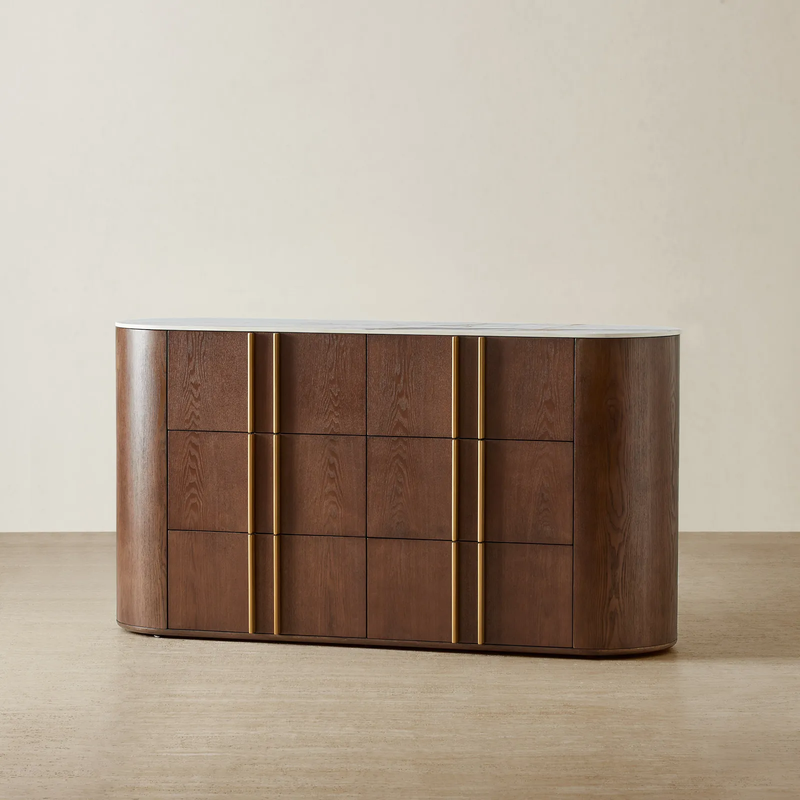 The Sir Lionell Dresser marries timeless form with purposeful function, crowned by a pristine white sintered stone top. Six generous drawers glide open with effortless precision, offering abundant space for your most treasured possessions.