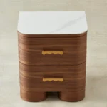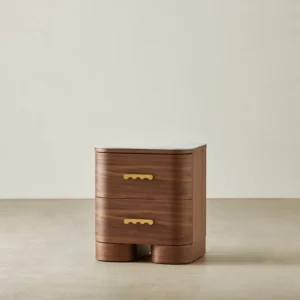 The Terzetto Kids Bedside Table brings warmth and playfulness to a child’s room. A place for books, bedtime treasures, and those small things that make the night feel cosy. Its rich mocha walnut finish pairs with a smooth white top, while whimsical wave-shaped brass handles add a cheerful touch to its rounded form.